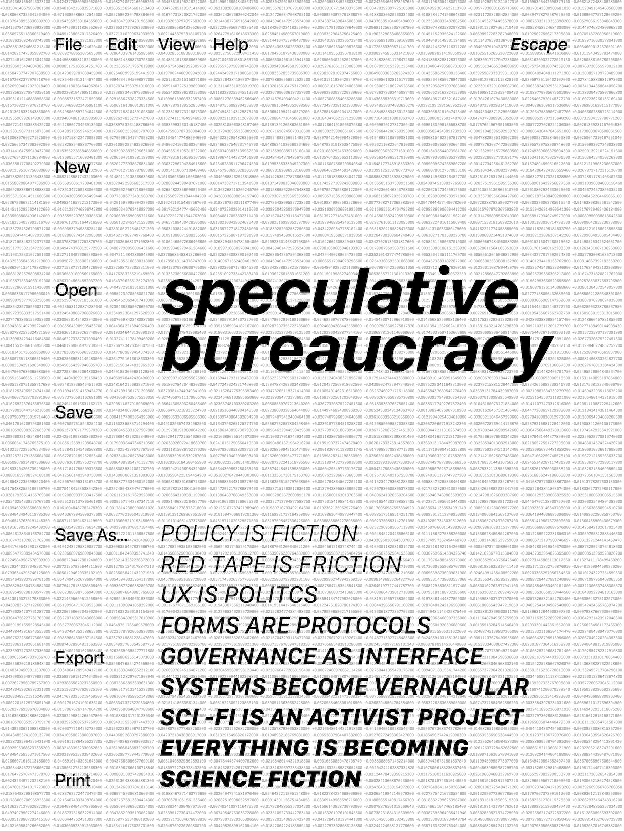 My practice operates in a space I’m calling Speculative Bureaucracy—using the visual languages of administration and policy to open up a space for criticism of the systems we experience every day. This is low theory applied to interface design, finding new uses for the everyday aesthetics of control in an effort to imagine different futures.